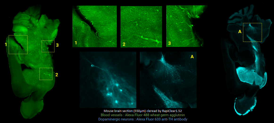 染料:血管:488;多巴胺能神经元:633;切片厚度:550um