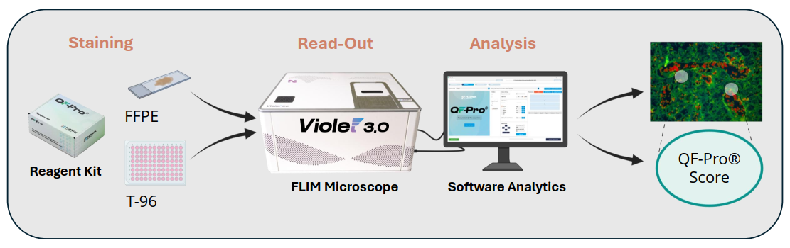 Hawk Biosystems自主研发的 QF-Pro® (Quantifying Functions in Proteins)技术平台,是一款基于 FRET/FLIM 技术的增强型生物成像平台,专为突破传统光学显微镜的衍射极限、量化 10nm 以下的分子事件而设计。该技术拥有多项国际专利(如 EP2972357 A1、PCT/EP2018/062719),涵盖 QF-Pro® 试剂、Violet 3.0 荧光寿命成像显微镜(FLIM)及分析软件,形成 “试剂 - 仪器 - 分析” 一体化解决方案。